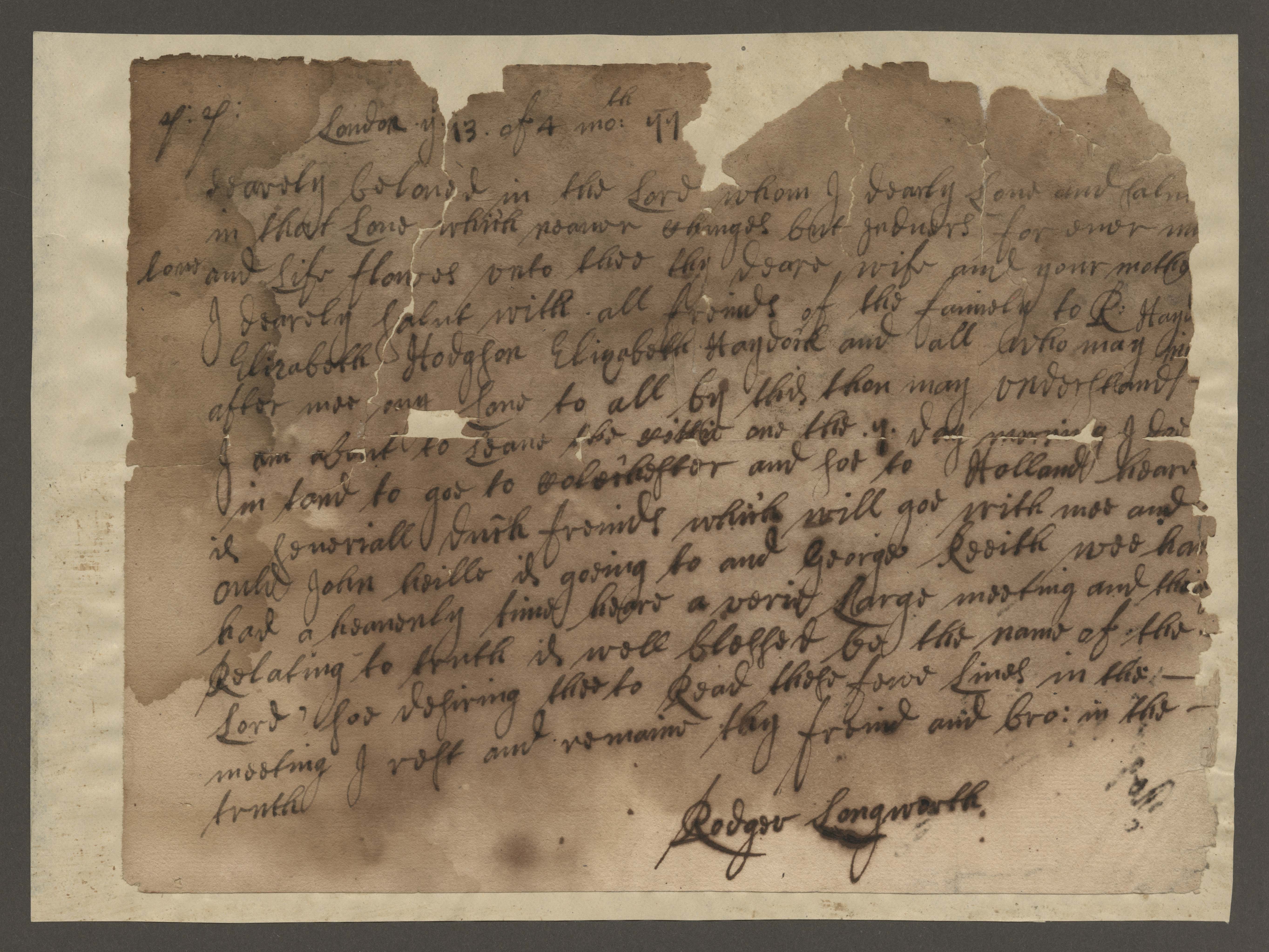 - Letter dated June 22, 1677 (June 12, 1677 Old Style) from Roger Longworth to Phineas Pemberton. He begins by sending his greetings. He then tells Pemberton that he plans to go to Colchester and then Holland with several other Friends.