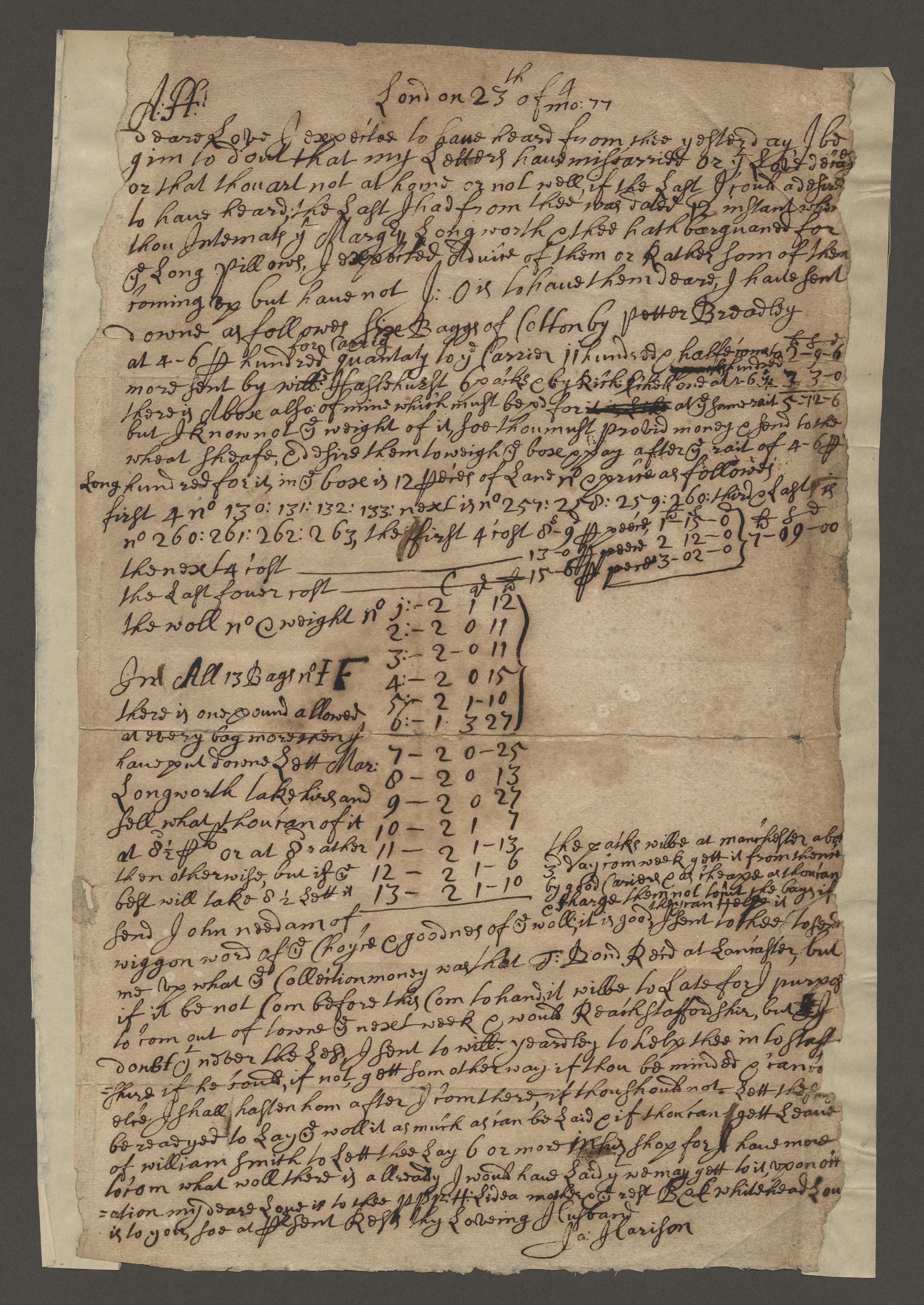 - Letter dated July 3, 1677 (June 23, 1677 Old Style) from James Harrison to his wife, Ann Harrison. He expresses his concern at her lack of response to his previous letter on June 27, 1677 (June 17, 1677 Old Style) in which he asked her to conduct business. This is followed by a financial account containing goods and prices. The latter half of the letter repeats and summarizes much of the information in his previous letter from June 27, 1677 (June 17, 1677 Old Style).