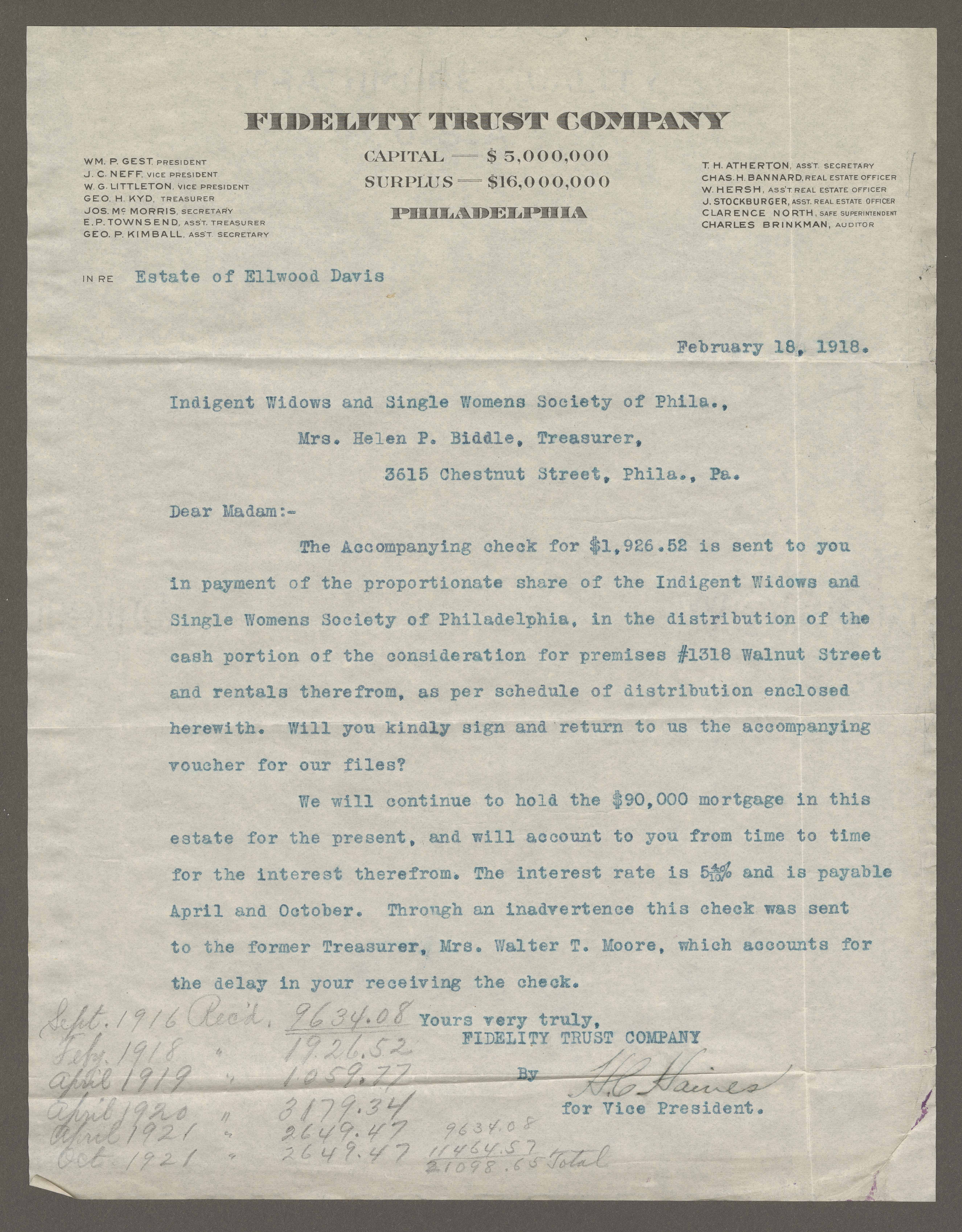 - A notice accompanying a check of $1926.52, which was the share bequeathed to the Indigent Widows' and Single Women's Society for the payment and rental of property at 1318 Walnut St.