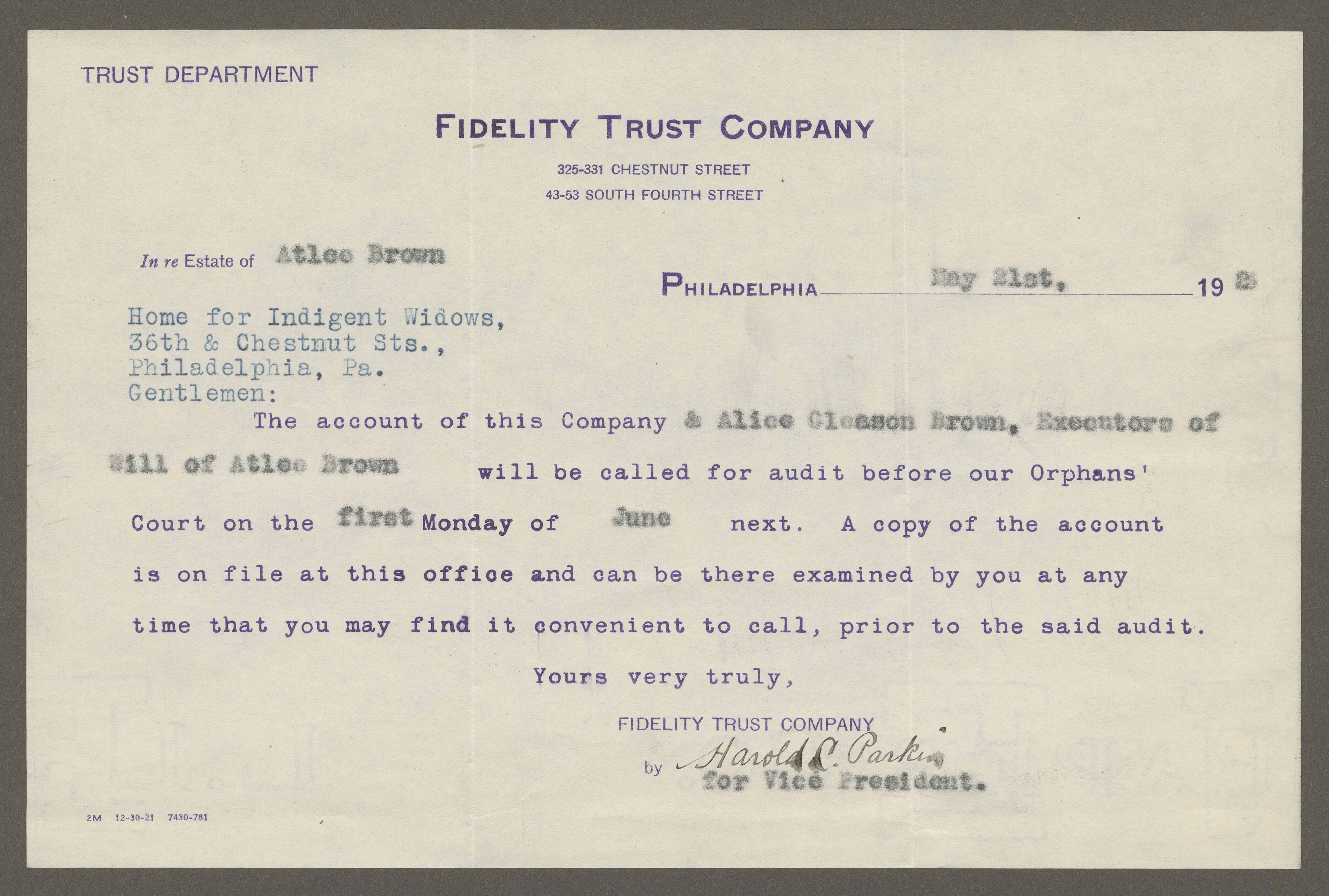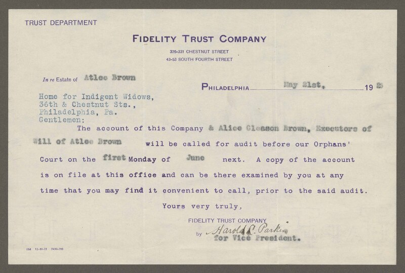 - Indigent Widows' and Single Women's Society register of wills: estate of Atlee Brown, 1925
