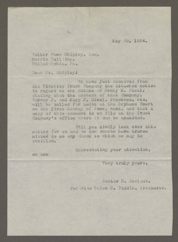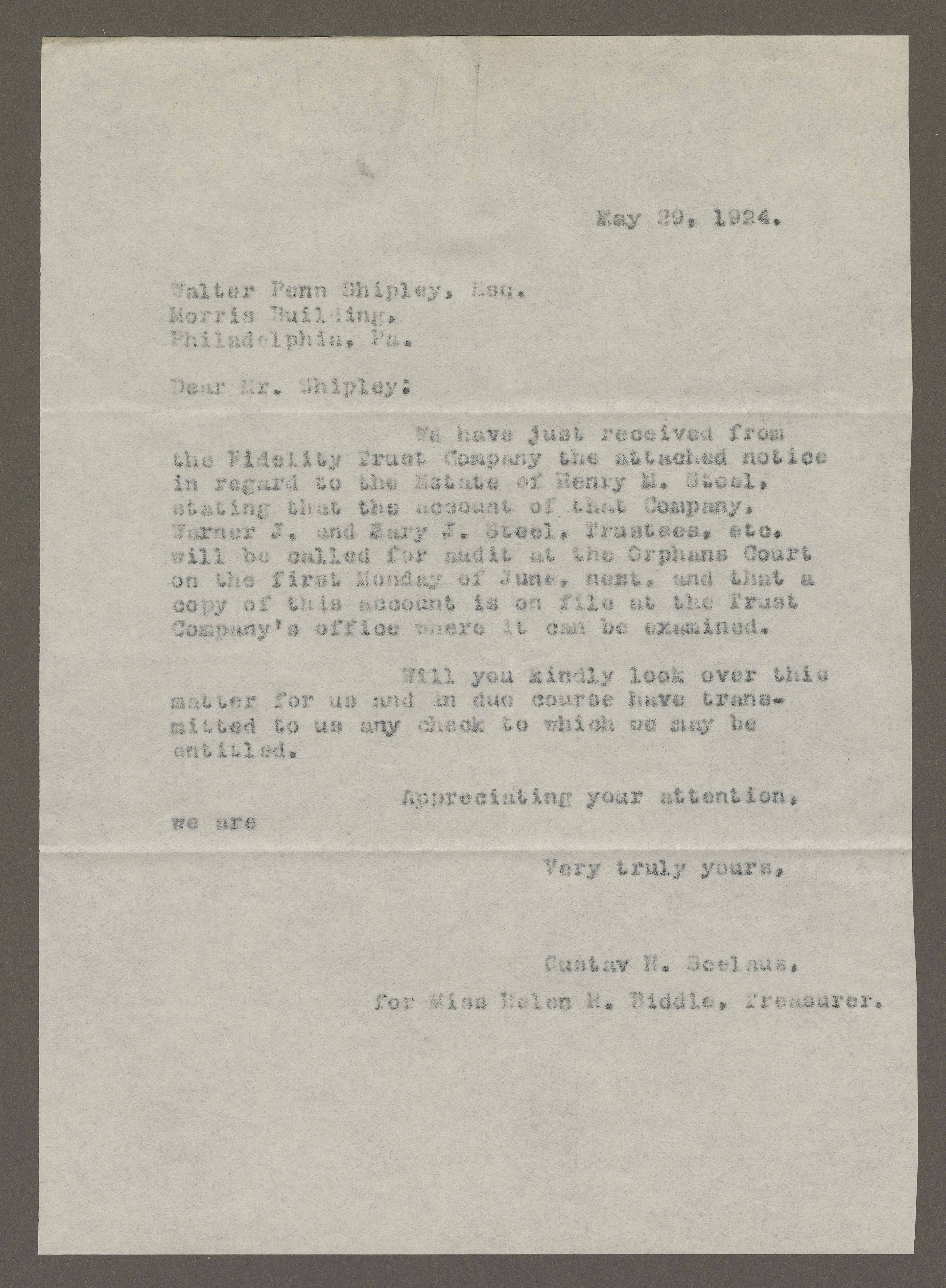 - A letter to Walter Penn Shipley, lawyer of the Indigent Widows' and Single Women's Society, from Gustav H. Seelaus, representing Helen R. Biddle, treasurer of the Society, concerning a notice of the estate of Henry M. Steel.