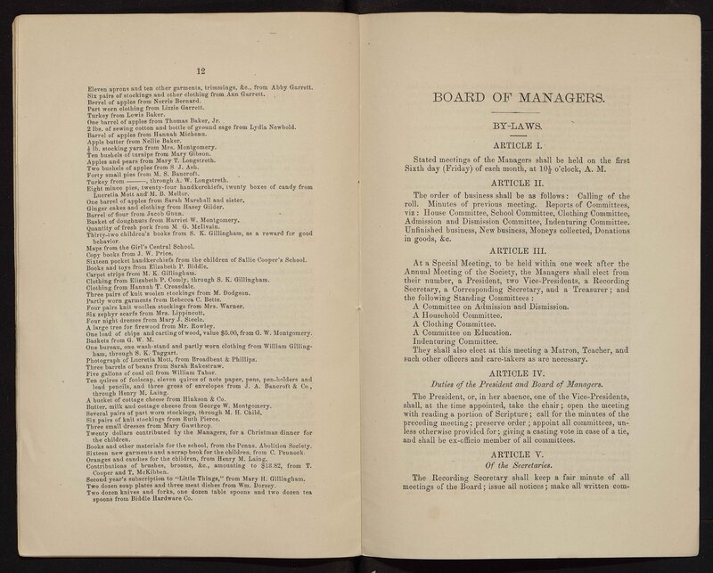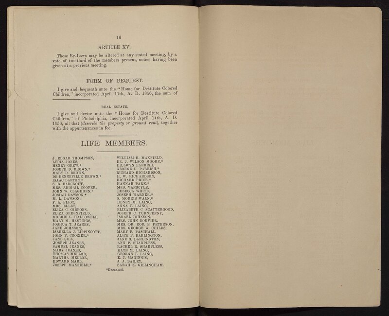 - The Philadelphia Home for Destitute Colored Children, a Quaker charity, was founded in 1856. Its stated goals were to provide a home, food, clothing, and an education for black children in Philadelphia. The minutes of the Home provide a record of its activities, bylaws, finances, donations, and membership subscriptions.