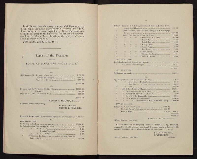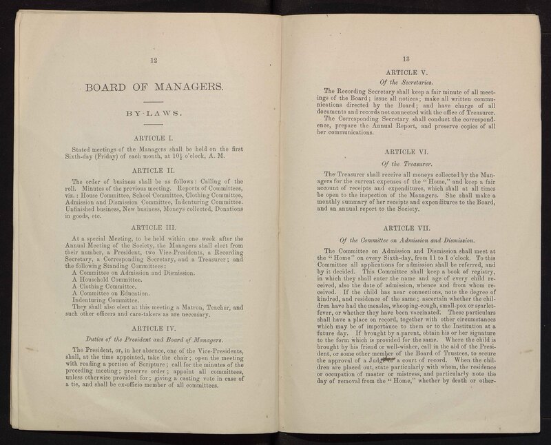 - The Philadelphia Home for Destitute Colored Children, a Quaker charity, was founded in 1856. Its stated goals were to provide a home, food, clothing, and an education for black children in Philadelphia. The minutes of the Home provide a record of its activities, bylaws, finances, donations, and membership subscriptions.