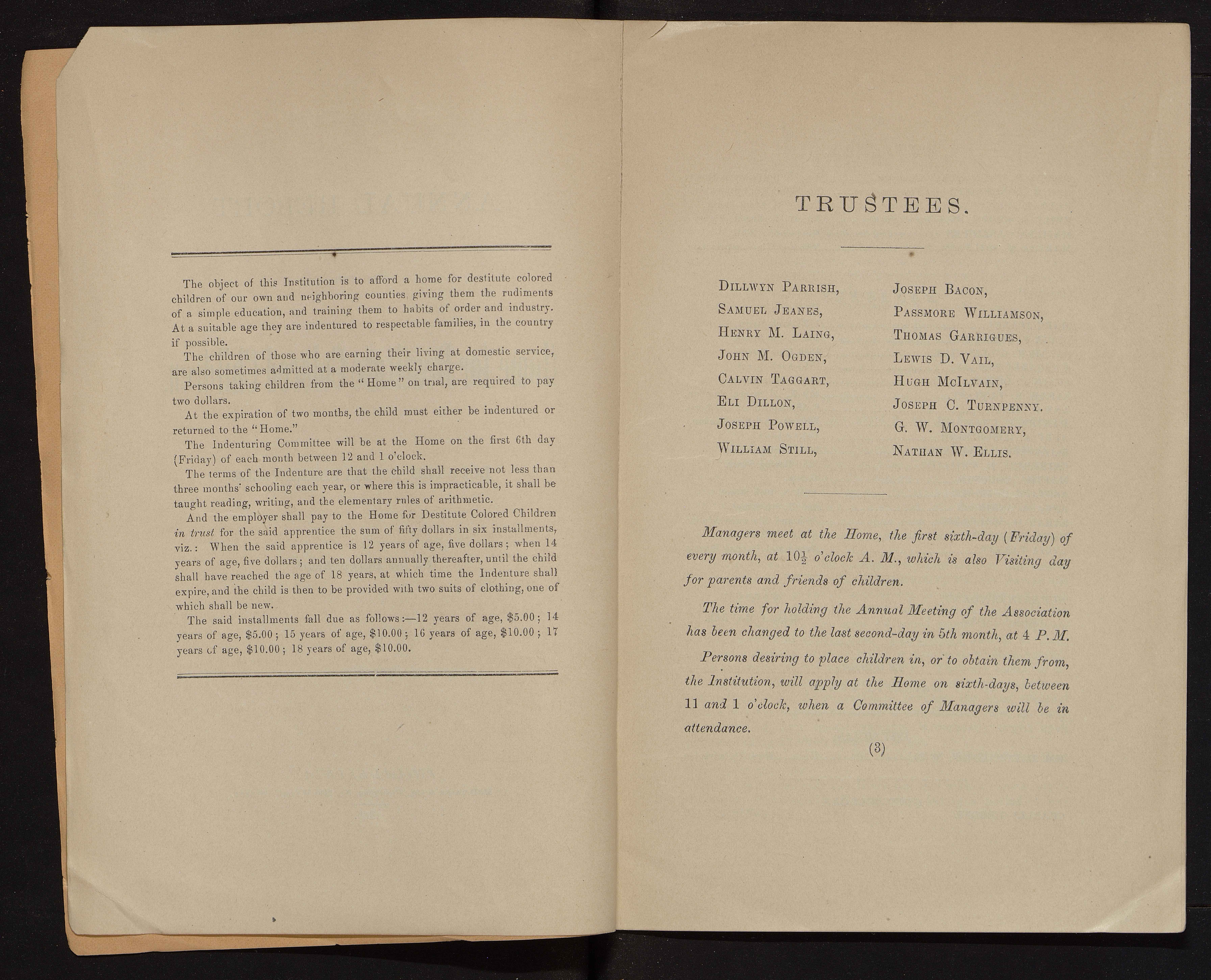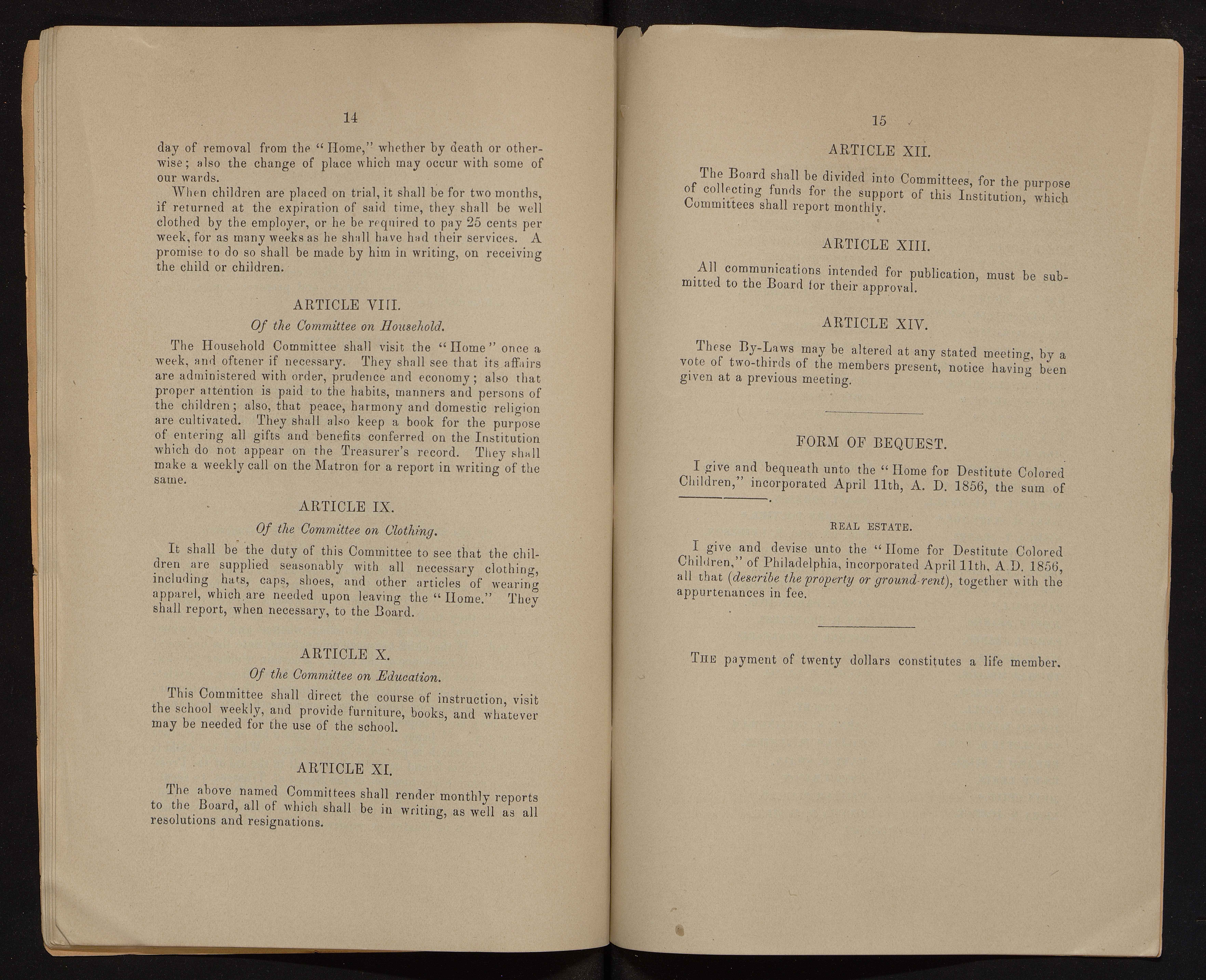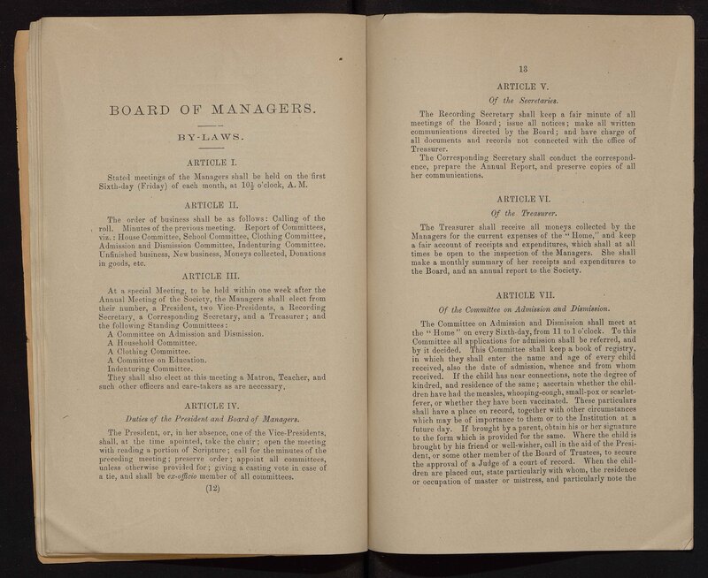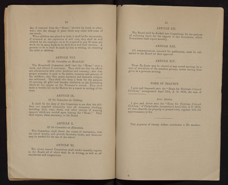 - The Philadelphia Home for Destitute Colored Children, a Quaker charity, was founded in 1856. Its stated goals were to provide a home, food, clothing, and an education for black children in Philadelphia. The minutes of the Home provide a record of its activities, bylaws, finances, donations, and membership subscriptions.