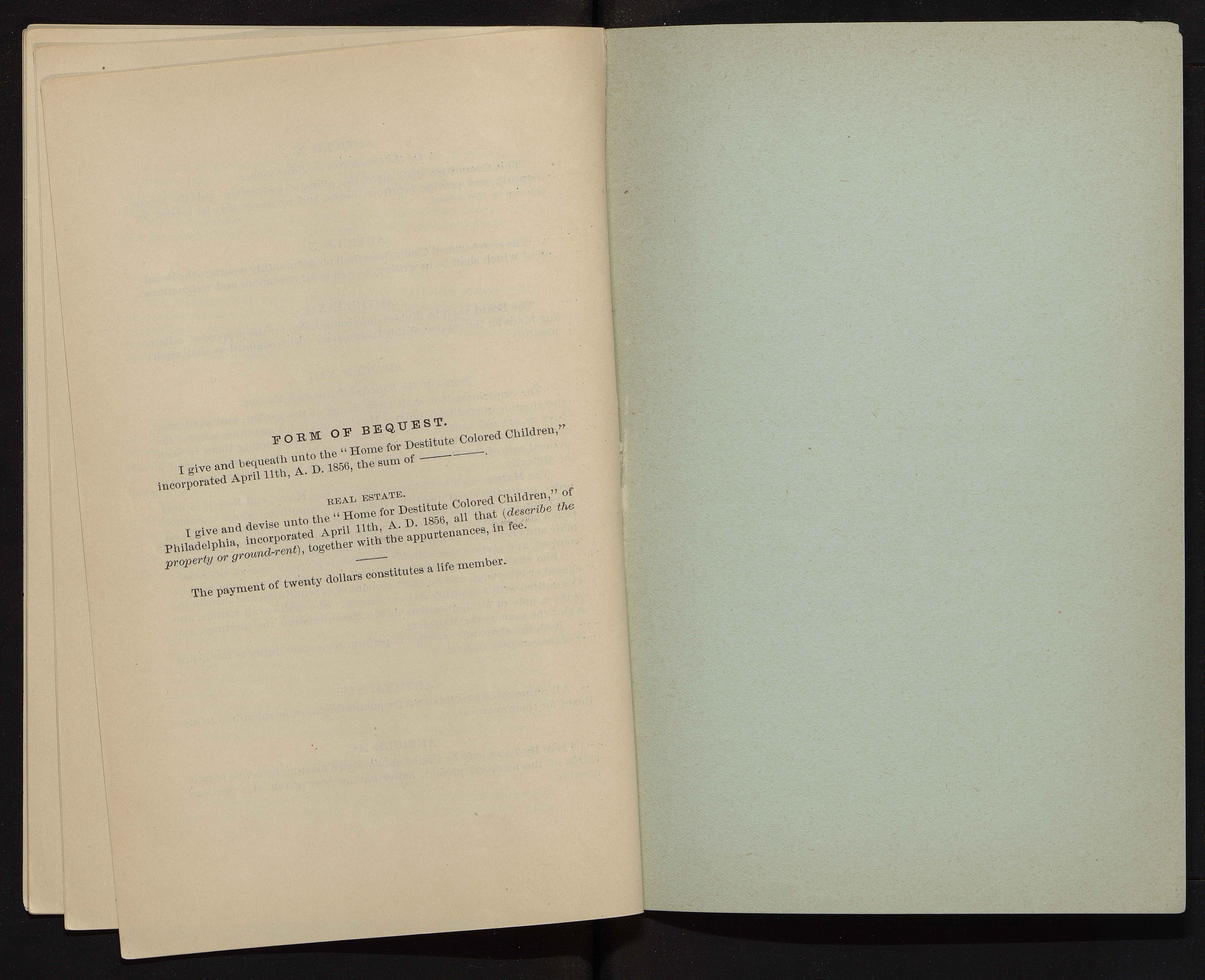 - The Philadelphia Home for Destitute Colored Children, a Quaker charity, was founded in 1856. Its stated goals were to provide a home, food, clothing, and an education for black children in Philadelphia. The minutes of the Home provide a record of its activities, bylaws, finances, donations, and membership subscriptions.