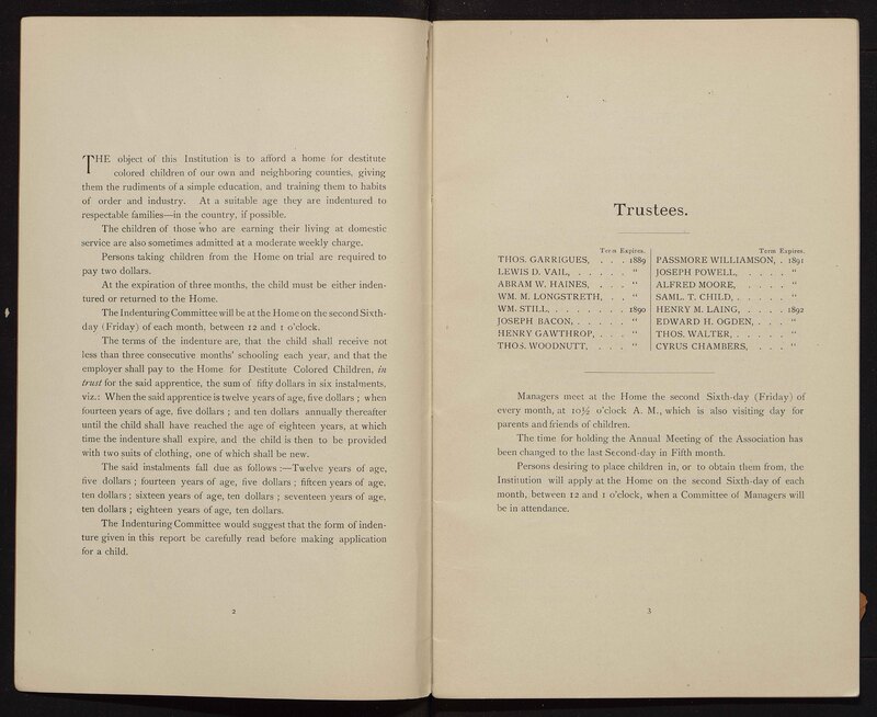 - The Philadelphia Home for Destitute Colored Children, a Quaker charity, was founded in 1856. Its stated goals were to provide a home, food, clothing, and an education for black children in Philadelphia. The minutes of the Home provide a record of its activities, bylaws, finances, donations, and membership subscriptions.
