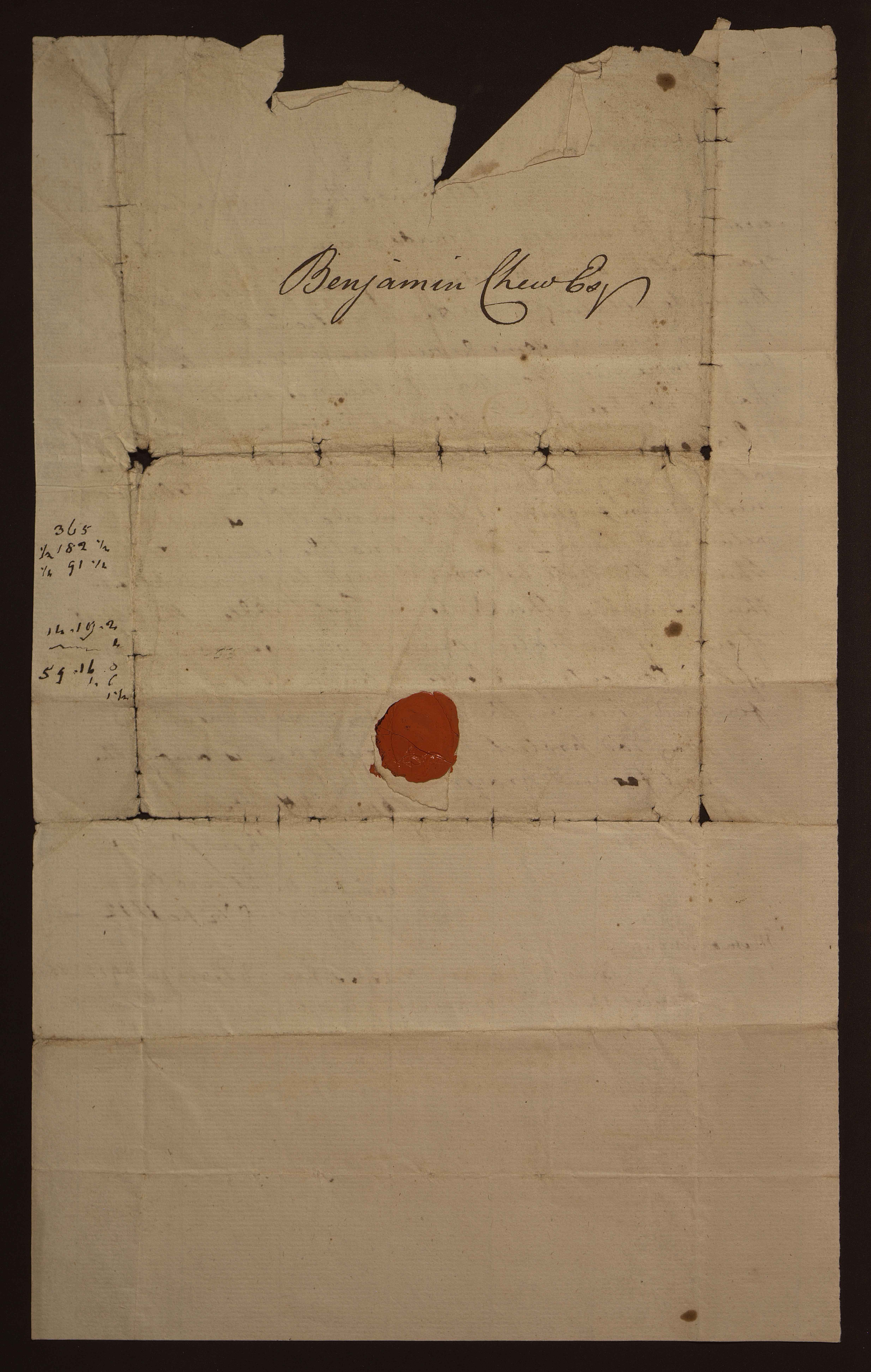 - Three letters from Benjamin Chew, Jr. to his father. The first letter seems to have been written on a note from a man asking Benajmin, Jr. if his father plans on selling his horses. The second letter is small and mentions Joshua Wallace and Thomas Biddle. On the back is a list of "deposits" from prominent men to one another, such as Edward Tilghman and Daniel Coxe, though it does not specify what for, but to be delivered to Thomas Newman. The first two small letters may have been enclosed in the third.